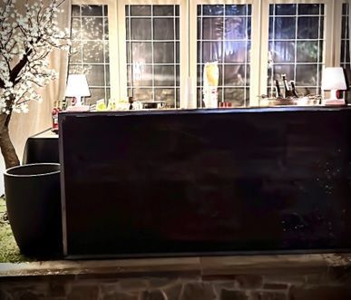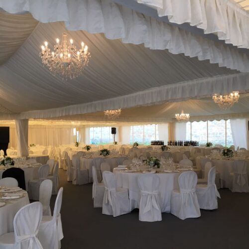 Tensostruttura con intelaiatura esterna in alluminio verniciato color champagne, tetti in pvc ignifugo trasparente Crystal, teli laterali scorrevoli e chiudibili in pvc ignifugo trasparente Crystal, tende laterali in poliestere ignifugo per copertura pali perimetrali e bozze di ancoraggio, sistema di gronde per lo scolo dell’acqua piovana, impianto di illuminazione con lampadari Deluxe, altezza in gronda 2,5 mt.